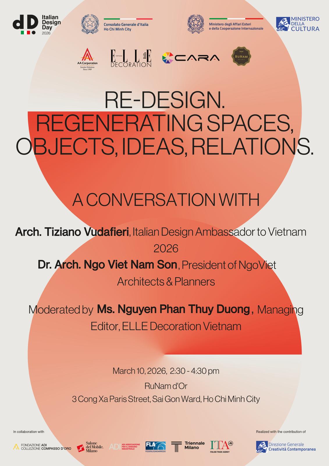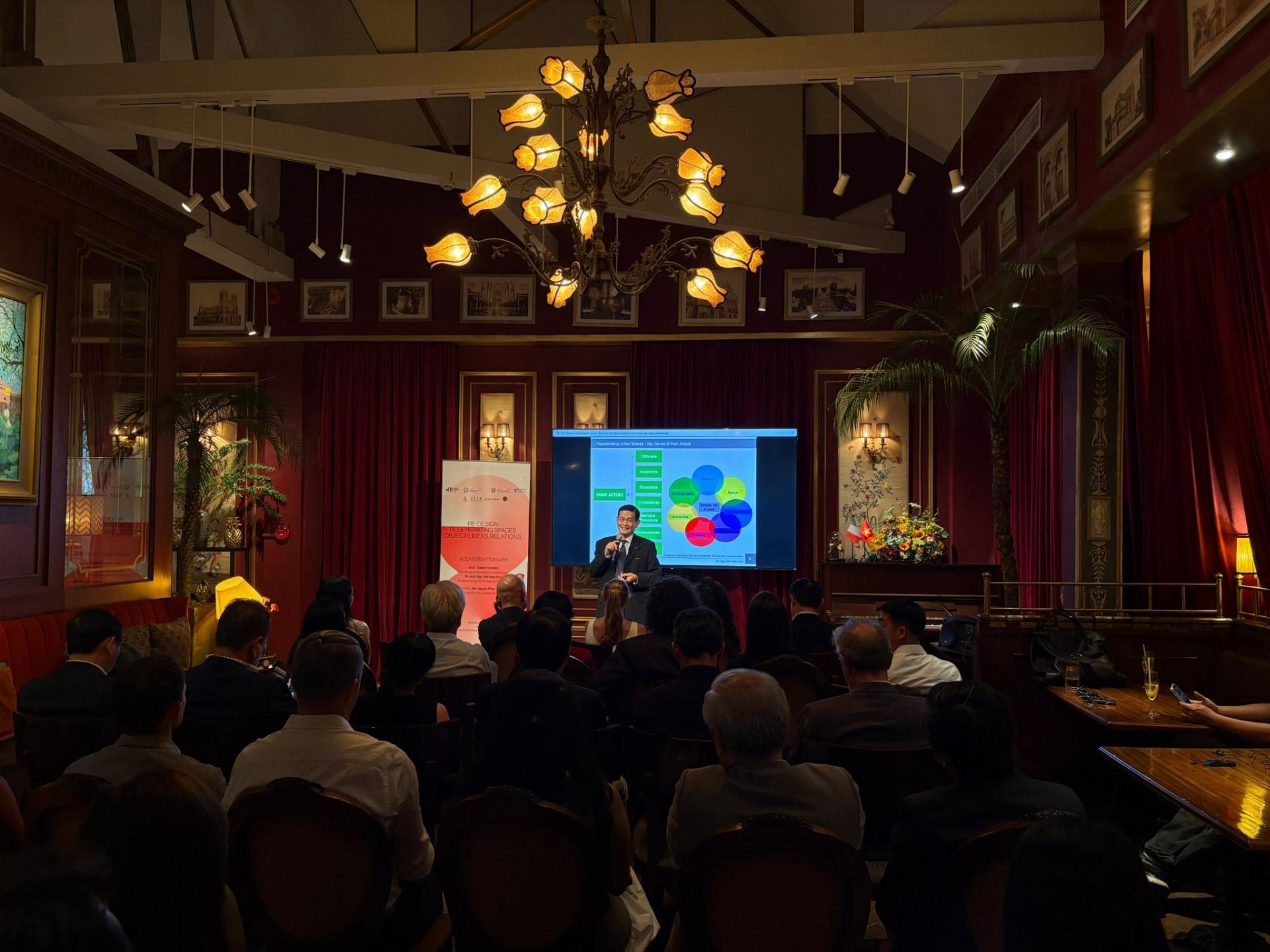 Architect Tiziano Vudafieri, Italian Design Ambassador in Vietnam for the 2026 edition, and architect and urban planner Ngo Viet Nam Son discussed the role of architecture and design in urban regeneration processes, focusing on innovation, sustainability, and the enhancement of existing heritage. The discussion, moderated by Nguyễn Phan Thùy Dương, Managing Editor of ELLE Decoration Vietnam, took place in the iconic historic building that was once the residence of Marie-Alfred Foulhoux, whose steel roof structure was built by Gustave Eiffel’s company and which today hosts Run Am d’Or.